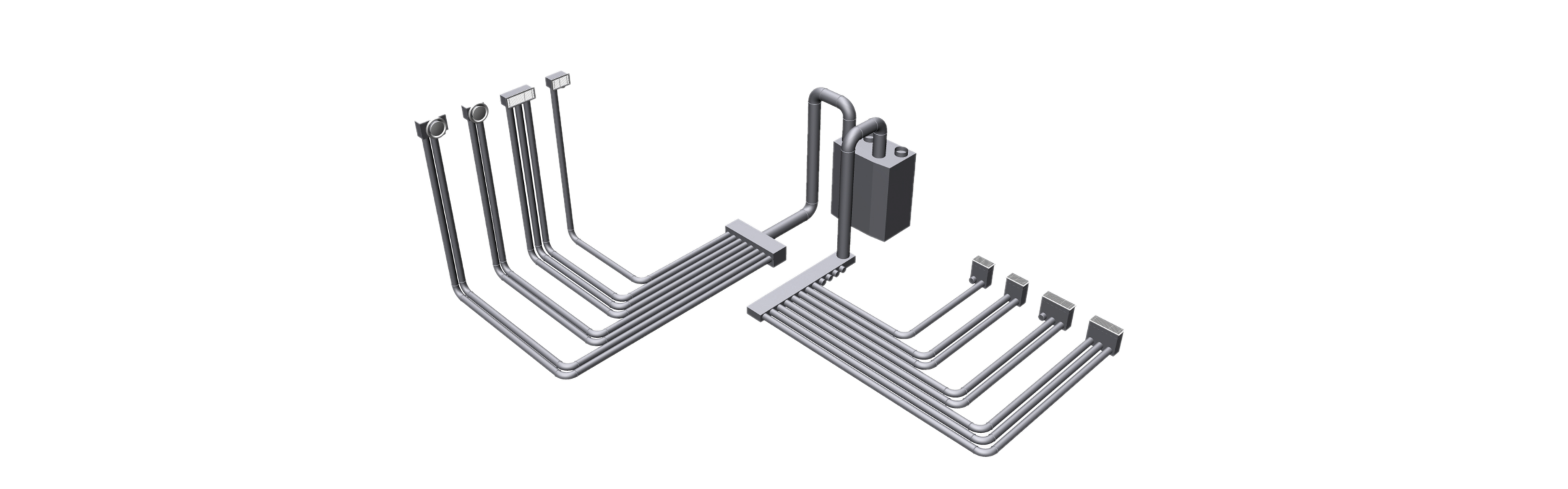 The radial principle involves individual ducting tubes from each extraction and supply point to plenum and distribution boxes connected to the mechanical unit. This significantly reduces pressure drops and power loss while eliminating cross contamination and noise transfer.