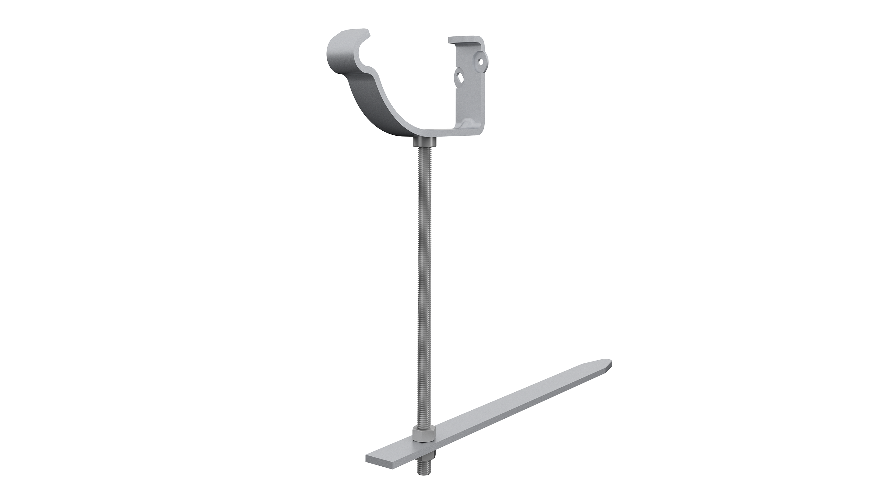 Rise and fall bracket with 300mm solid spike used for drive-in fixing to wall. Bracket is mounted on 250mm threaded bar allowing adjustment of gutter level.