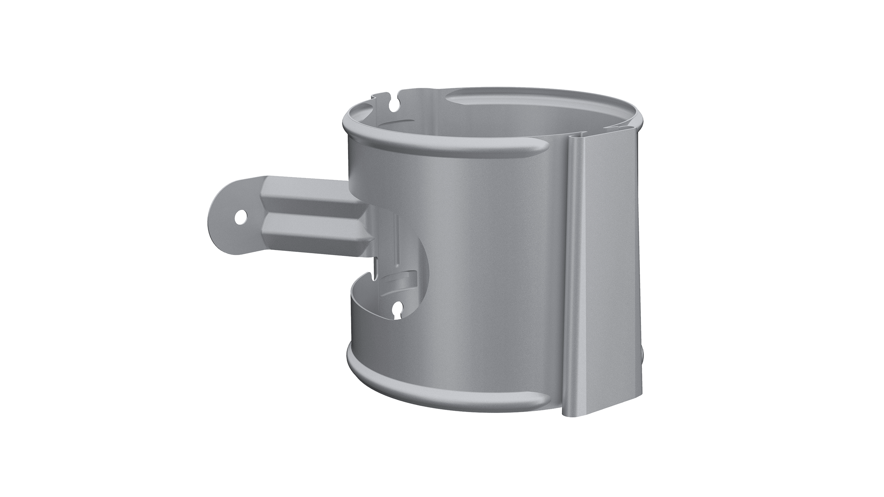 Holder for round downpipes, fits the pipe perfectly. Made of a single sheet of metal and secured with a wedge at the front.