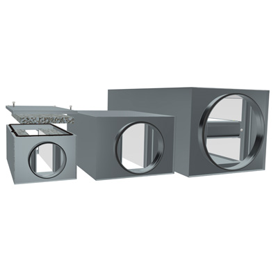 KVDPX is a rectangular attenuator with circular connections and a low installation height.