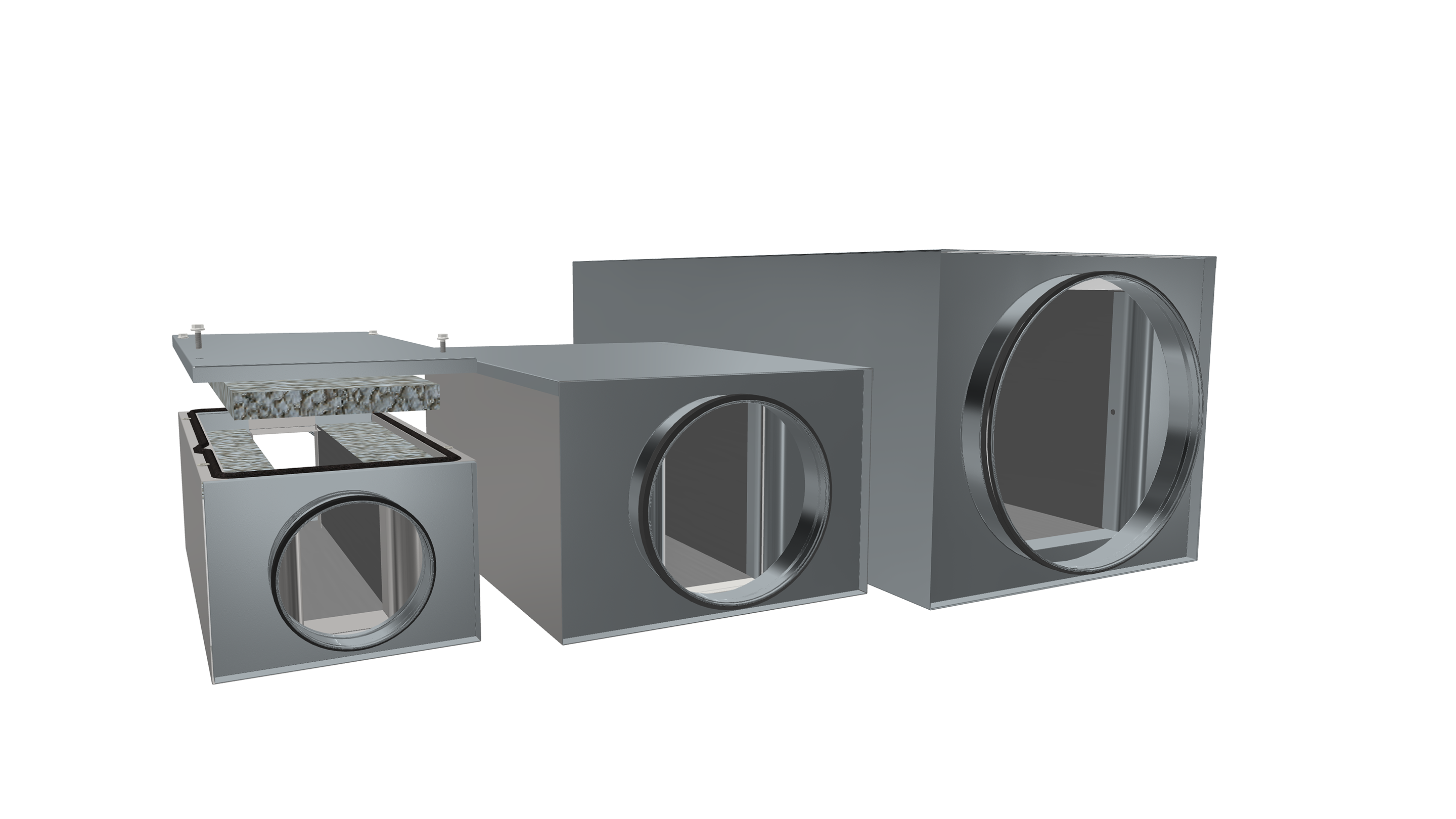 KVAPL is a rectangular attenuator with circular connections and a low installation height.