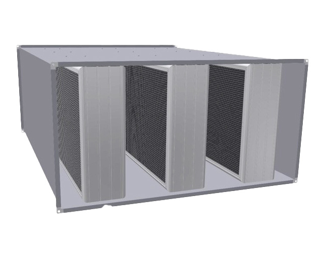 Rectangular straight attenuator from the TUNE series. TUNE-PS is constructed using Lindab’s TUNE-PA splitter. The attenuator is manufactured with a casing of galvanized sheet steel and stone wool absorption material covered by a plastic inter-liner and wire mesh to prevent the migration of fibres into the airstream and to protect the acoustic media from grease and oil in kitchen applications.