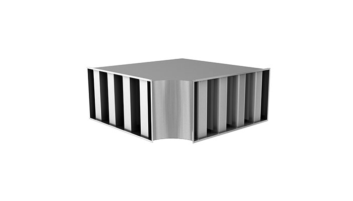 Rectangular curved attenuator from Aerodim™ series. SLRB is equipped with Aerodim™ baffles (splitters). The attenuator is manufactured with frame of galvanized sheet and absorption material type Lindtec™. The absorption wool is easy to clean while preventing the dispersal of fibres.