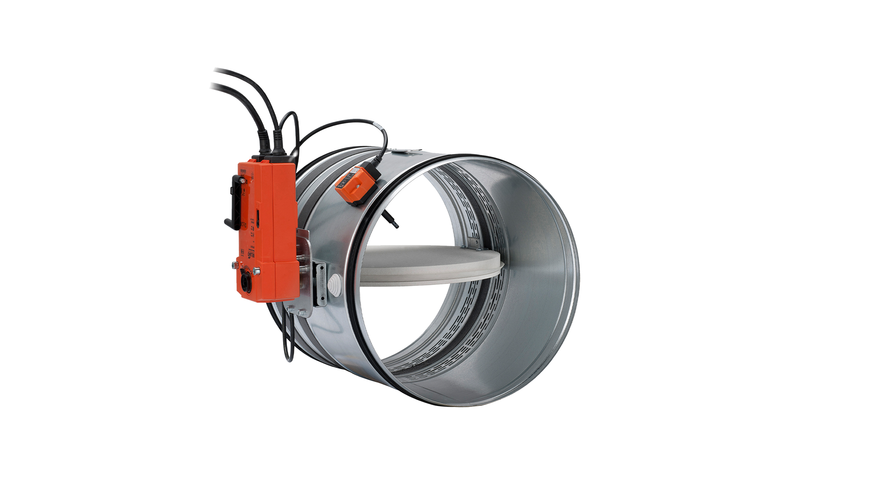 Circular fire damper for air duct system that penetrate fire resistance walls or floors. With 25 mm thick closing blade made from refractory material. Casing leakage performance class C according to Standard EN1751:2014 section C.3.
