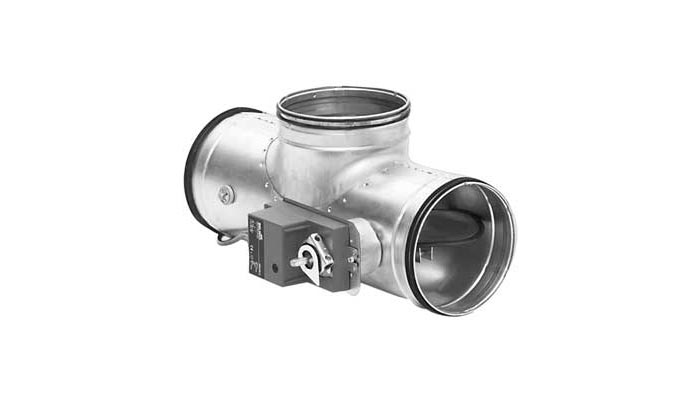 Consists of an extended T-piece with two linked DTU dampers and a 24 or 230 V electric motor installed. Can be used for "by pass" ducts. This means that it replaces two conventional dampers + two couplings + one T-piece and is 20–30% shorter.