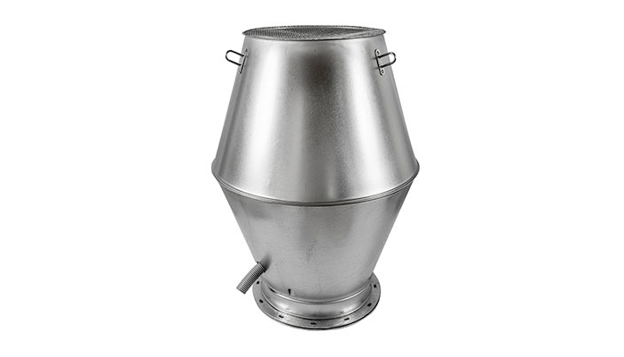 The hood is made of galvanised sheet steel, and can also be supplied in other materials such as stainless steel sheet 1.4301, stainless acid-resistant steel sheet 1.4404, aluzinc AZ185 and painted in various colours, to special order. It has a net over the opening and an internal rain funnel to collect rainwater and snow, which is drained out of the hood through a hose. The hose can withstand temperatures of between -45 and +65 °C.