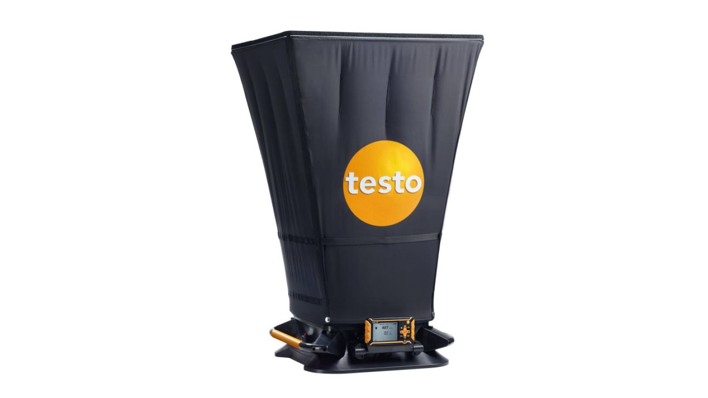 Make sure you get the testo 420 volume flow hood for larger ceiling outlets and at the same time enjoy multiple maintenance benefits on HVAC systems. Because the flow hood with the removable measuring instrument is not only exceptionally light, it also guarantees accurate volume flow calculations at swirl outlets