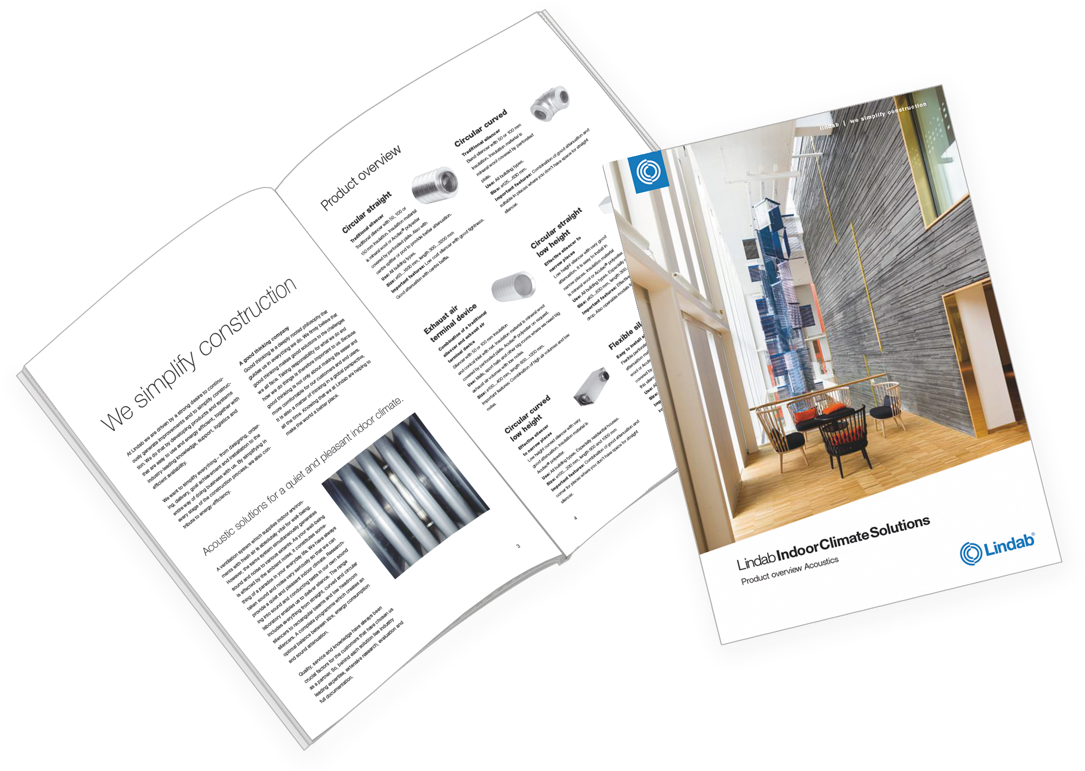 Lindab Acoustic is our range of sound attenuators, offering acoustic solutions and accurate sound calculations for optimised ventilation systems in buildings. Through decades of research and development we have gathered extensive knowledge and experience within the field of noise reduction, helping our customers design soundproof ventilation systems that contribute to healthier buildings for people to grow, live and work in.