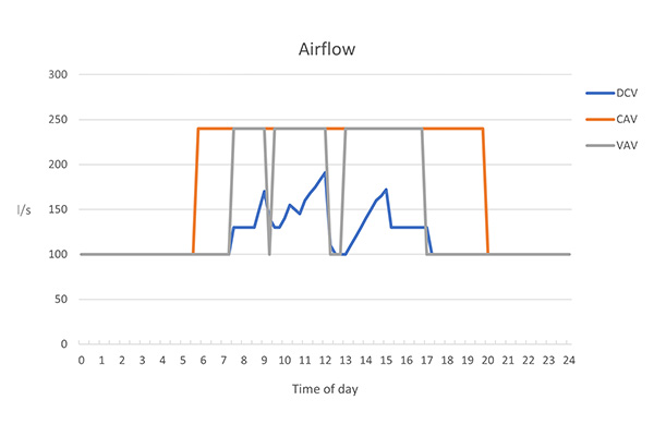 DCV is beneficial in buildings where the activity level varies. The rise of hybrid workplaces has turned a traditional office into a place that can be crowded one day and almost empty another day. In schools, classrooms are used part of the day, sometimes with a full class, sometimes with only a few students in the room. Gyms, apartments and restaurants are other examples of where the activity level varies over the day. With DCV, the ventilation system will adjust itself based on how the building is used.