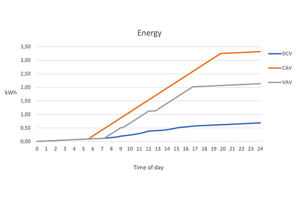 DCV is beneficial in buildings where the activity level varies. The rise of hybrid workplaces has turned a traditional office into a place that can be crowded one day and almost empty another day. In schools, classrooms are used part of the day, sometimes with a full class, sometimes with only a few students in the room. Gyms, apartments and restaurants are other examples of where the activity level varies over the day. With DCV, the ventilation system will adjust itself based on how the building is used.