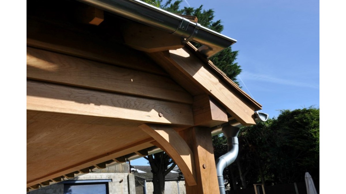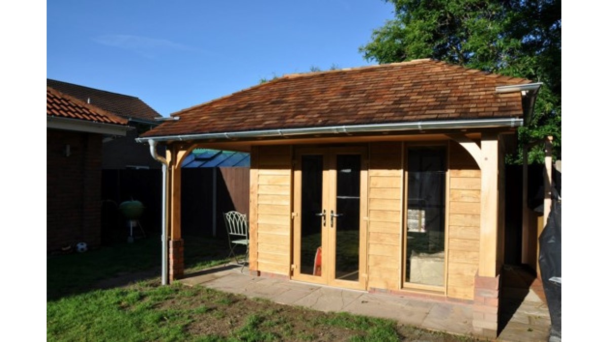 A key feature of the building is a truncated hipped shape roof with a raised gutter which provides shelter for the entrance to a covered seating area.