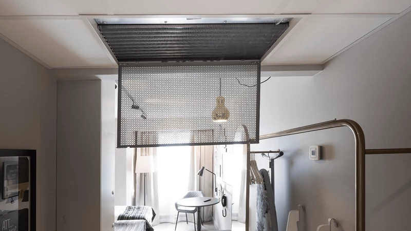Munio is well adapted to the typical ceiling assembly in the entrance section of a hotel room. The solution has also been adapted to the hotel's ceiling dimensions and makes the integration discreet in the 130 converted rooms. To clean the chilled beam, you just need to open the grate lock. In this way, the entire beam is accessible for quick and easy cleaning.